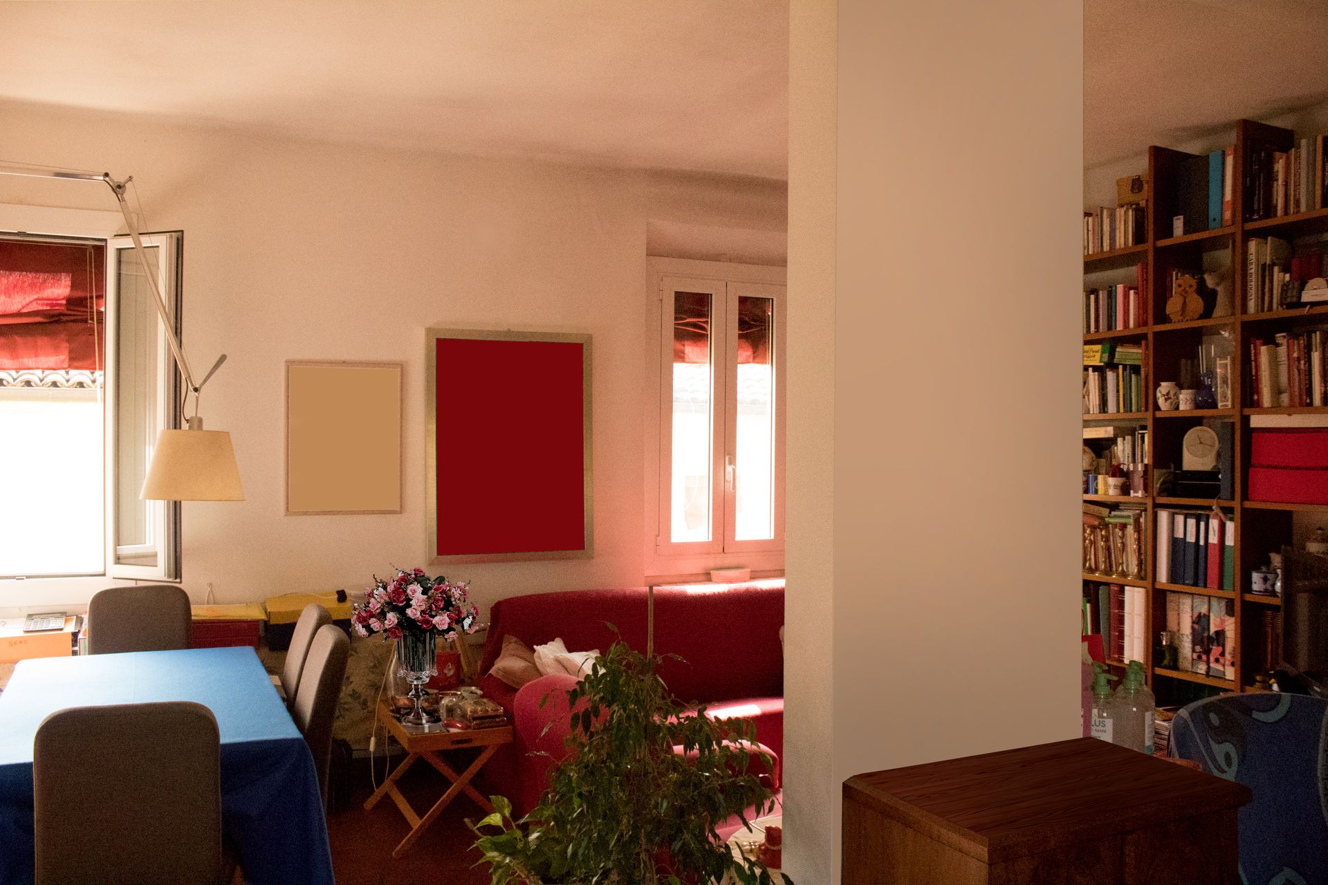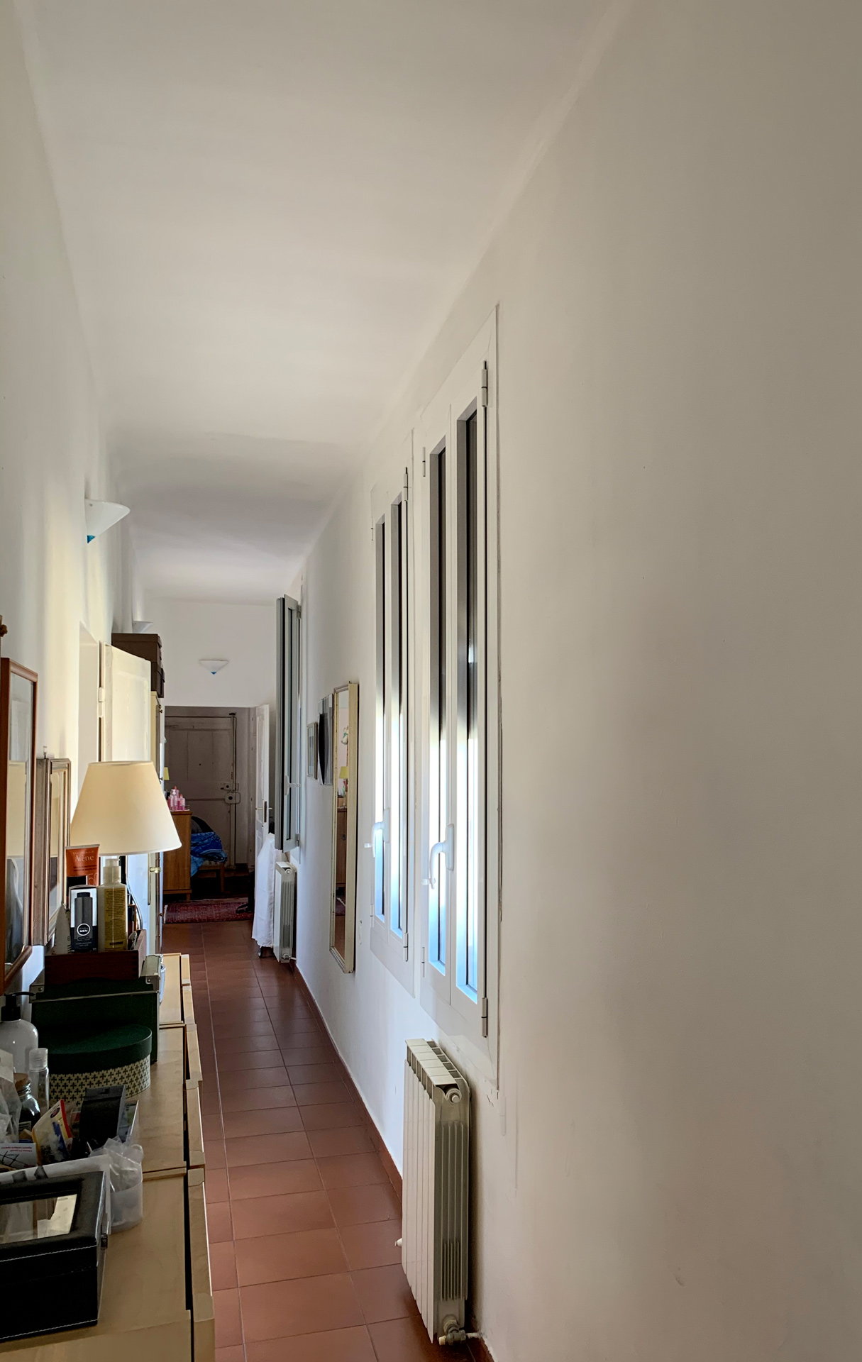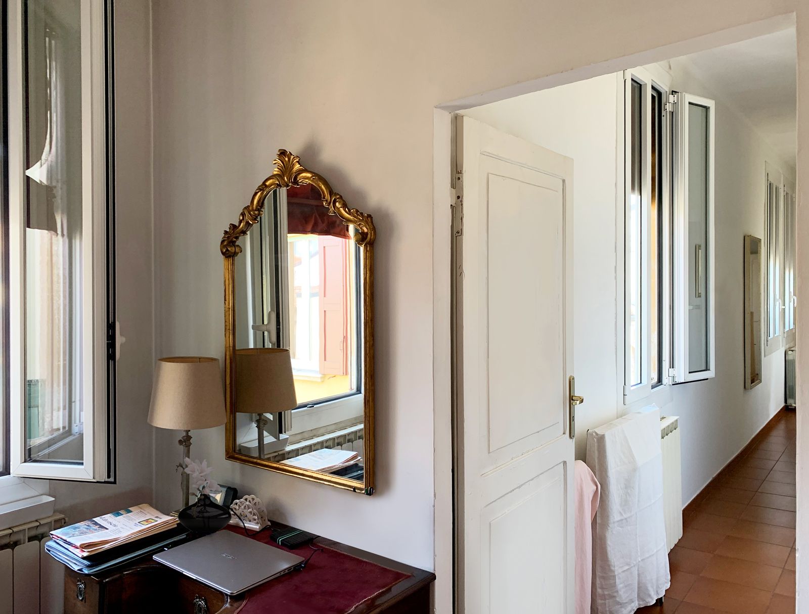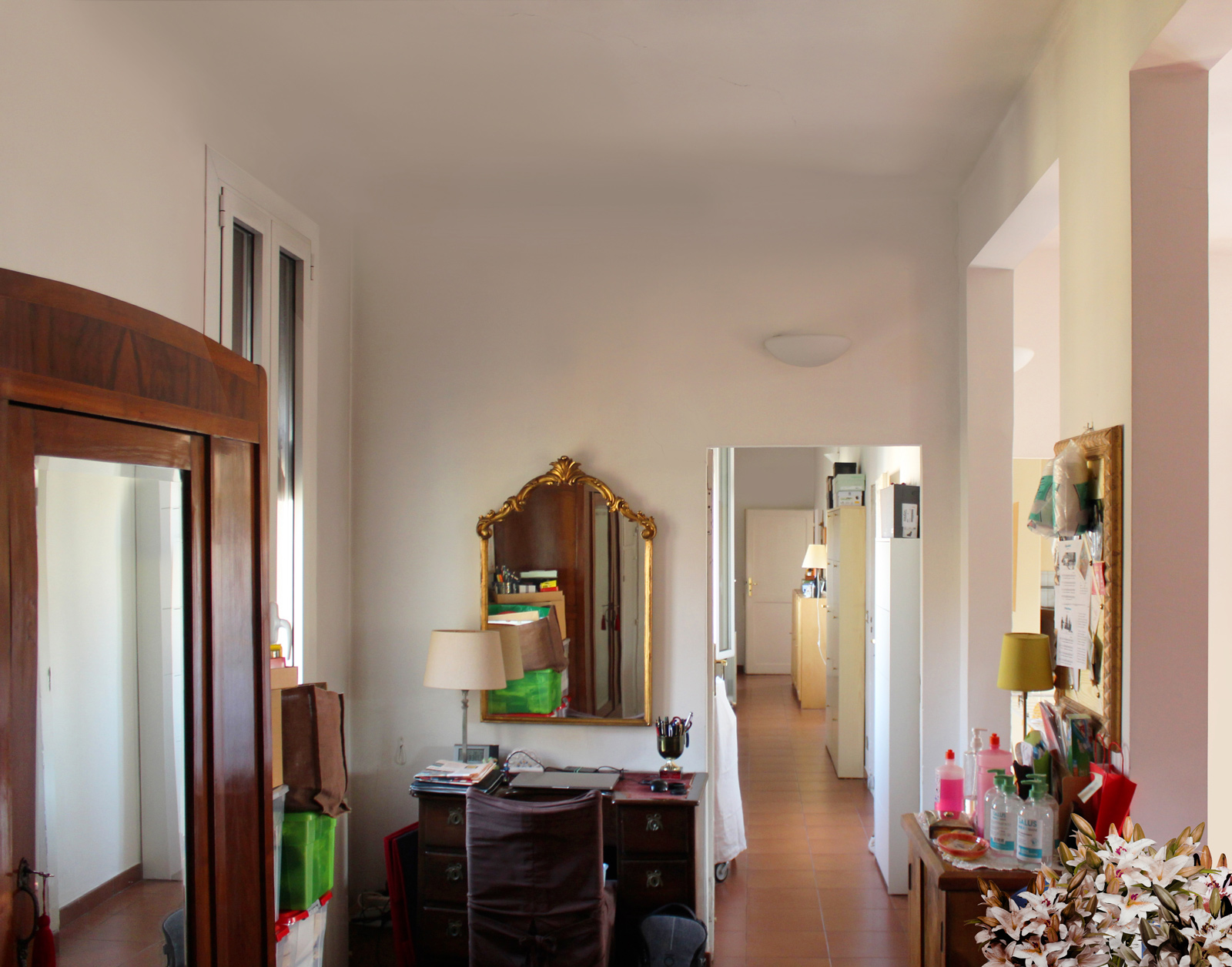 Molto amato per la sua felice esposizione a mezzogiorno, in questo appartamento si respira un’atmosfera semplice ma intrisa di storia. È composto da un ampio living open space, una piccola cucina molto luminosa, due camere da letto matrimoniali e due bagni, oltre a un terrazzino che affaccia sul verde dei giardini di via Fondazza e un corridoio illuminato da finestre con vista mozzafiato sui tetti di via Santo Stefano.